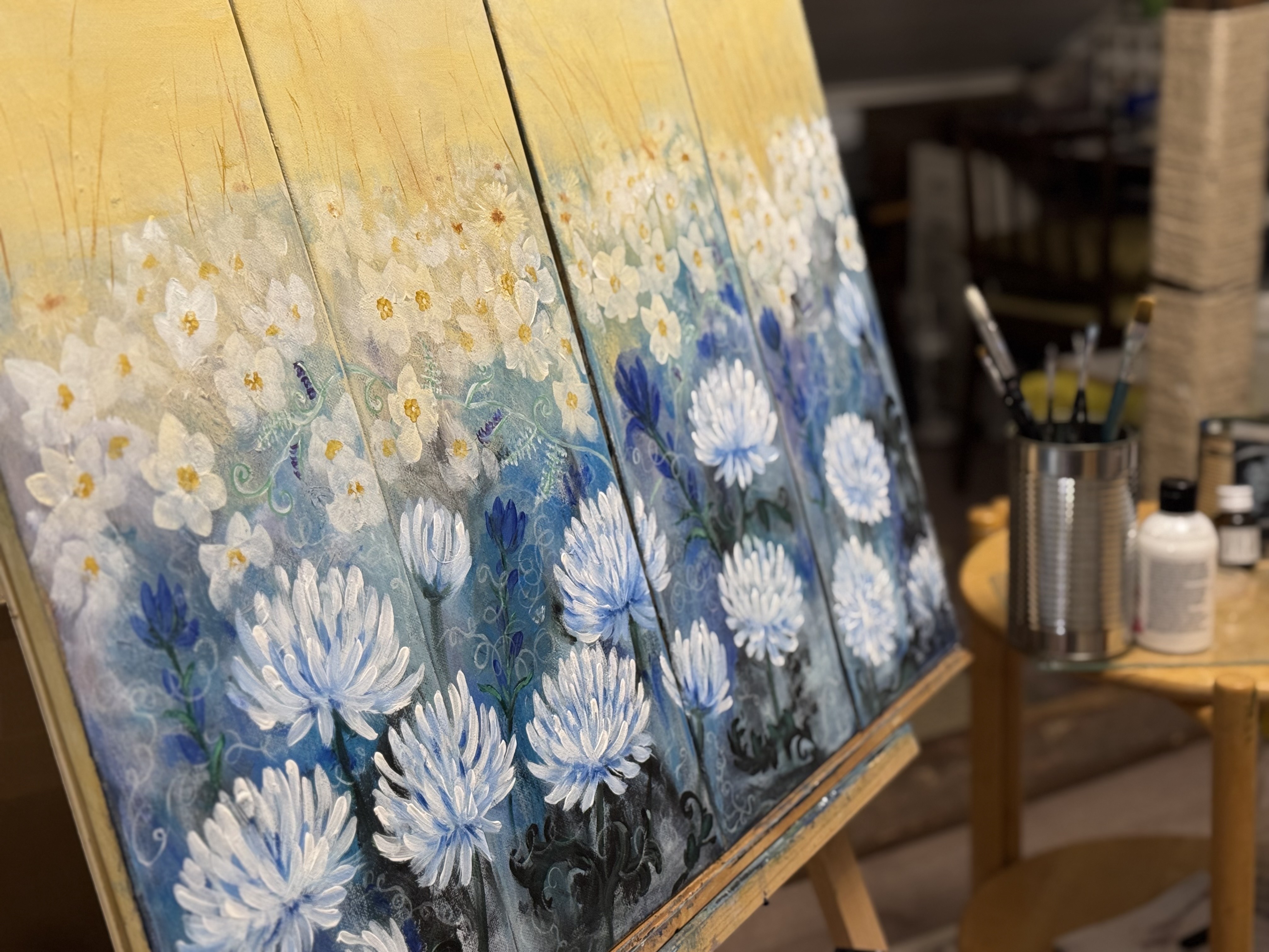 Puutarhassa. Akryylimaalaus L80cm x K60cm (4 x L20cm). Kuva aukeaa klikkaamalla suuremmaksi.