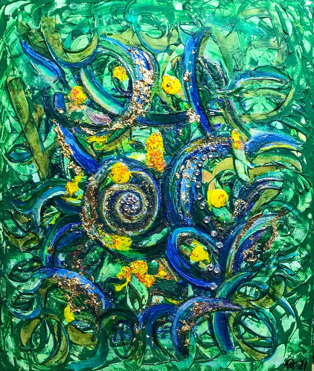 Puutarhassa on kaikenlaista. Puutarhassa -teos on kepeätunnelmainen, kesäinen sävyjen ja muotojen leikki. Pieni ripaus kultamaalia kulkee hiirenvirnan muodossa kaikkien osien yli. Sinisen eri sävyt ja keltaisen kontrasti muodostavat herkullisen valon ja varjojen leikin.
