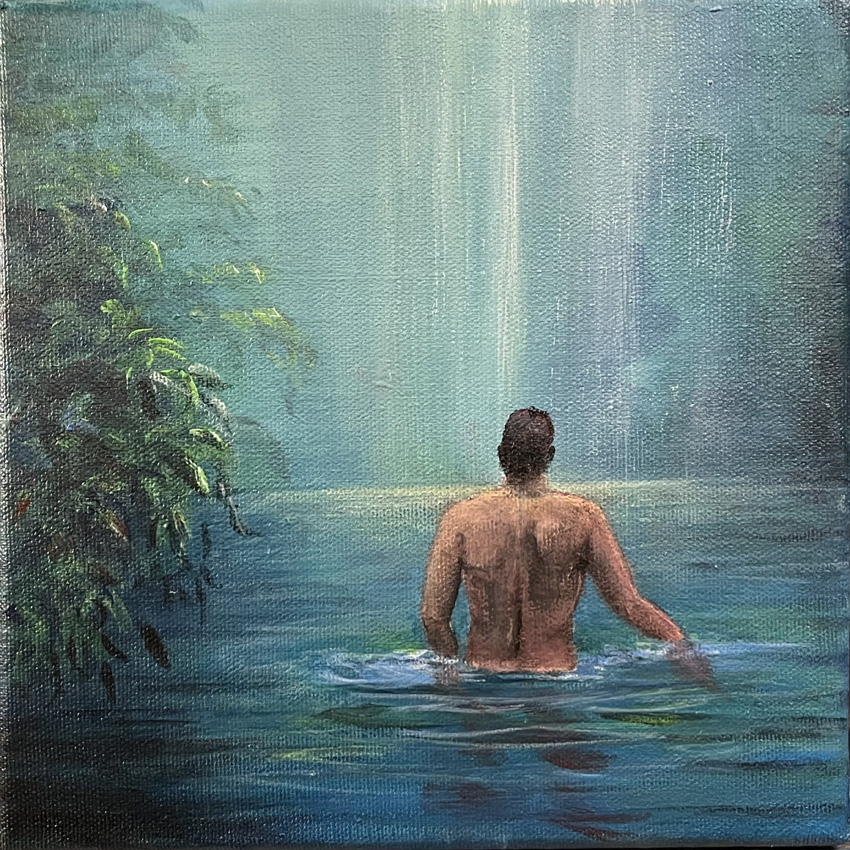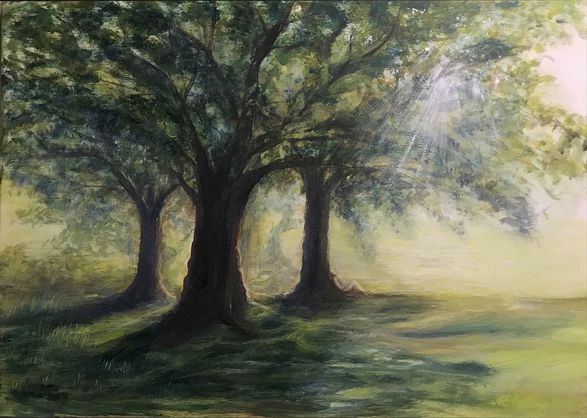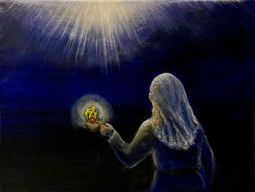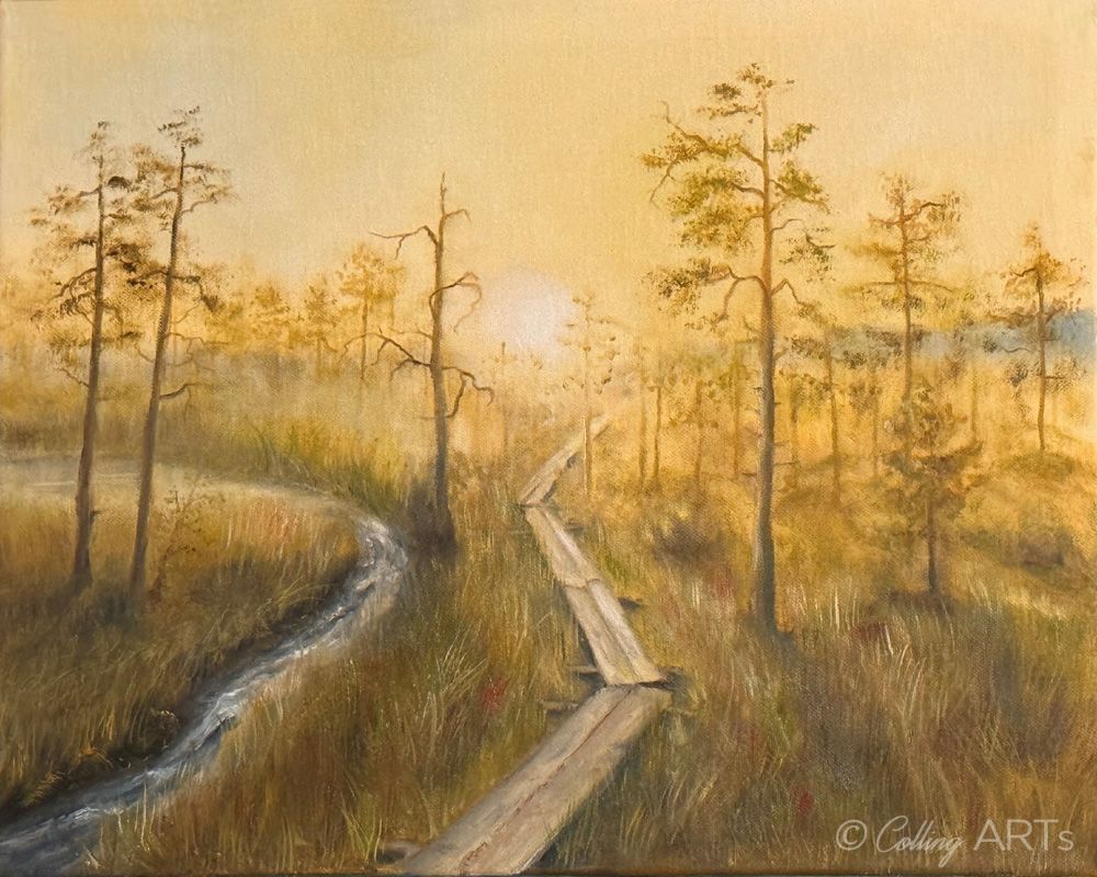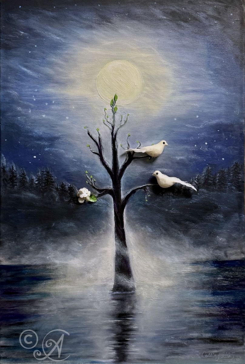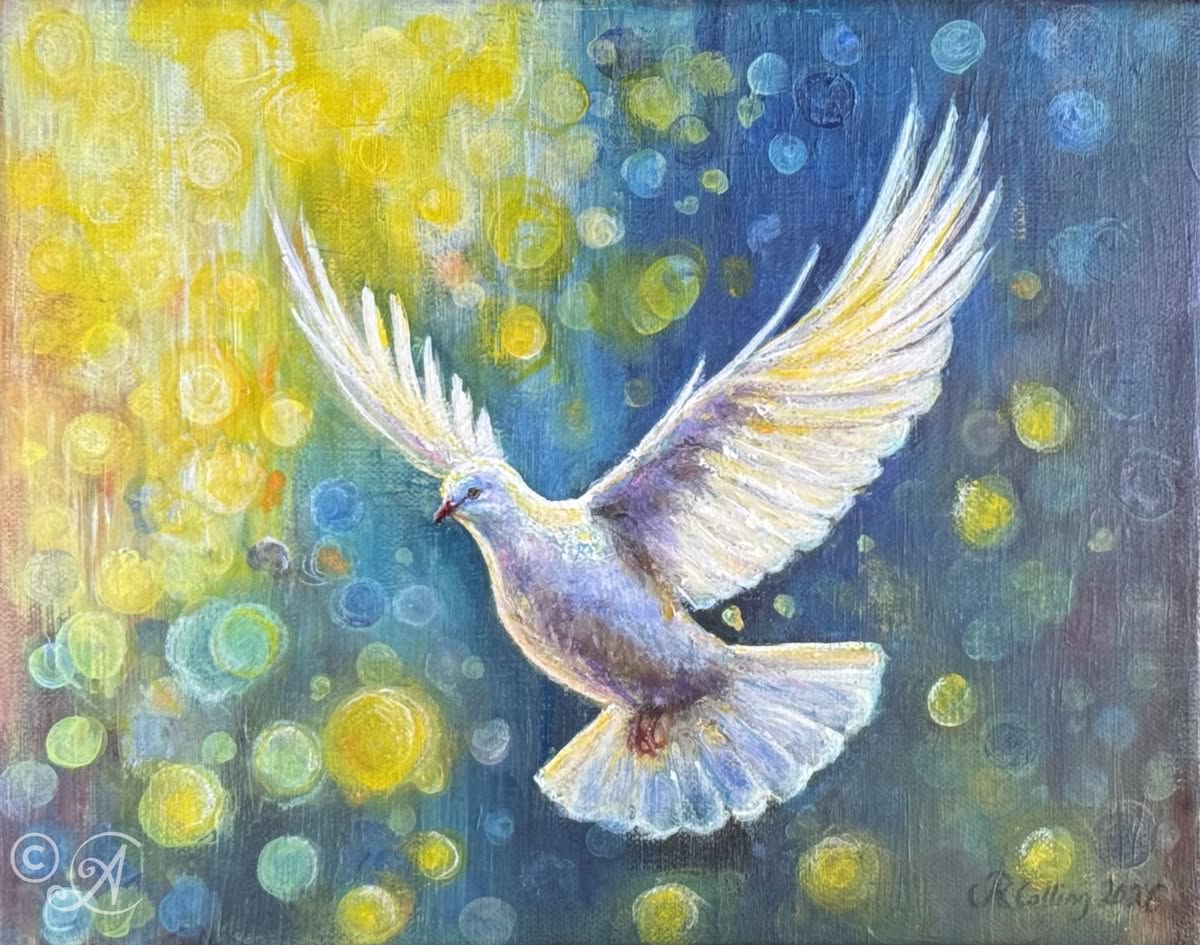 Ihana aamun valo, jossa auringon kultainen hehku korostuu kyyhkyseen lisätyllä kultauksella. Kultamaalia on jonkin verran lisätty myös veden kimallukseen. Tilaajan toiveiden mukaan hänen toivomansa aihe sekä valittu värit niin, että maalaus sopii hänen värimaailmaansa.