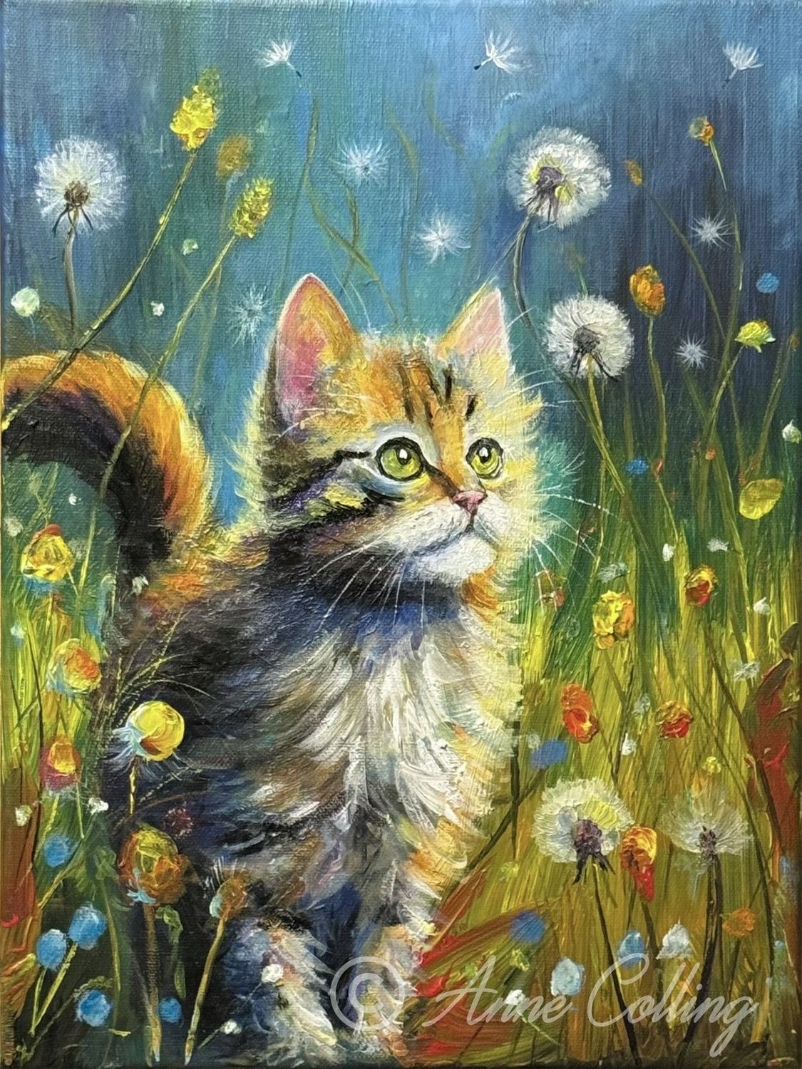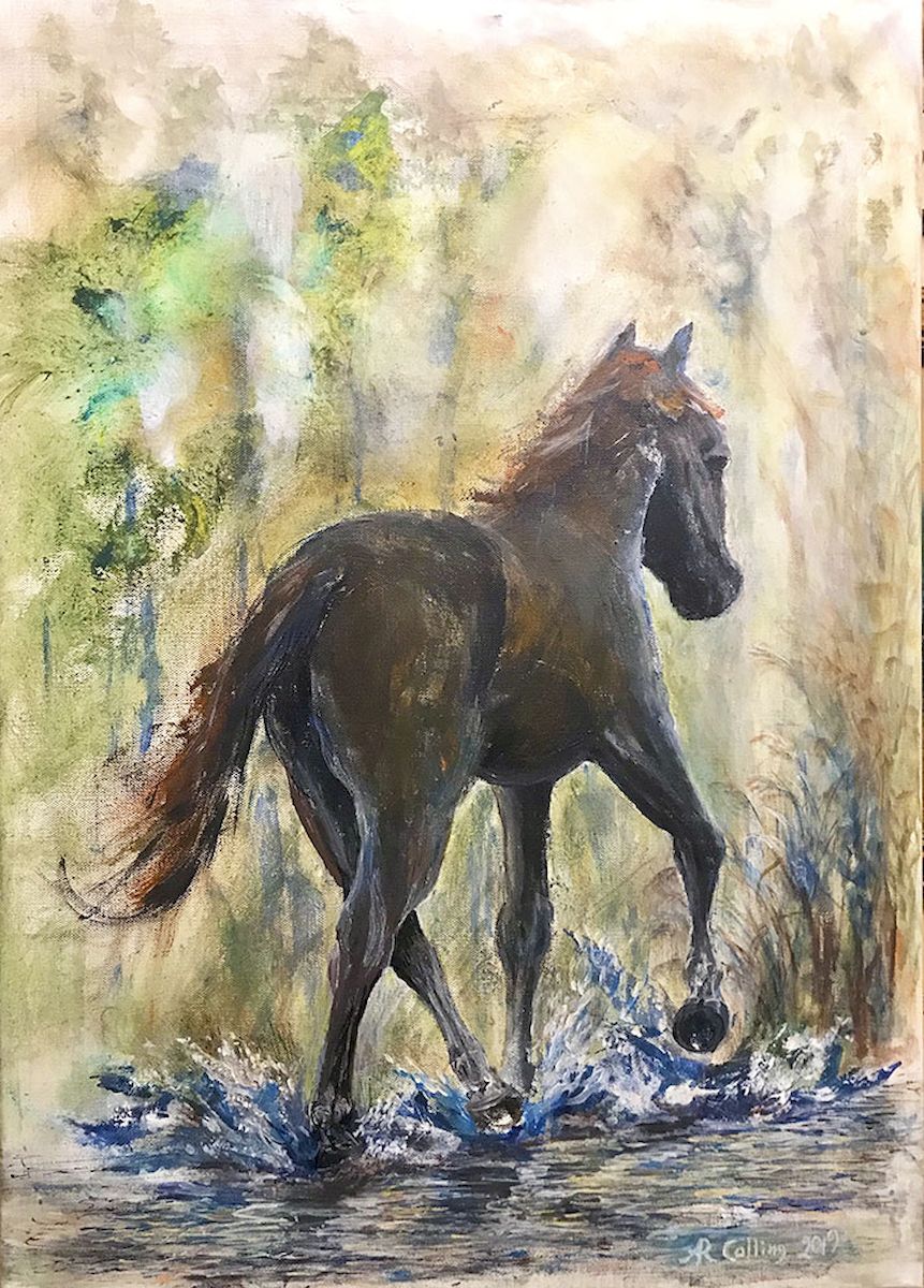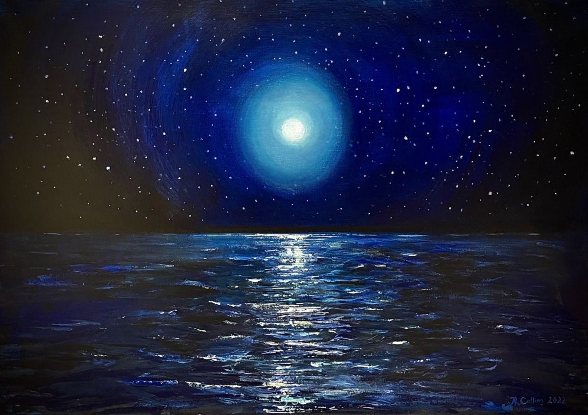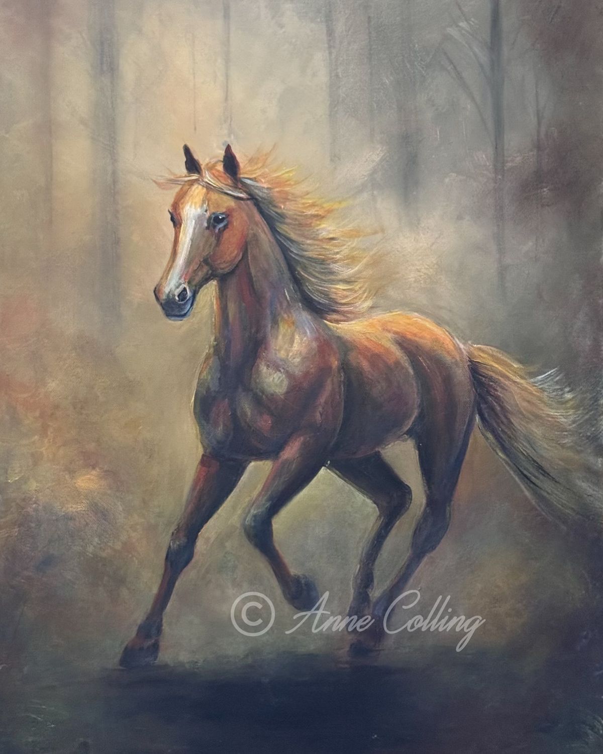 Ihana aamun valo, jossa auringon kultainen hehku korostuu kyyhkyseen lisätyllä kultauksella. Kultamaalia on jonkin verran lisätty myös veden kimallukseen. Tilaajan toiveiden mukaan hänen toivomansa aihe sekä valittu värit niin, että maalaus sopii hänen värimaailmaansa.