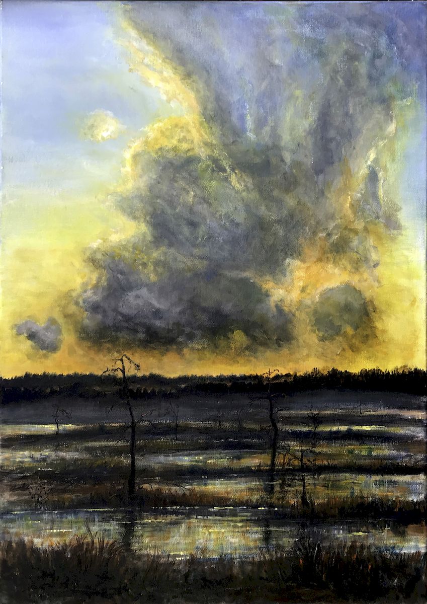 Syksyinen hetki, jossa kettu miettii tulevaa talvea. Meillä vierailee pihapiirissä melkein joka yö kettu ja se pitää jyrsijäkannan kurissa. Tämän vuoden syksy on ollut pitkä ja on tuntunut ettei talvi ala ollenkaan. Tämä maalaus on siitä ketusta ja syksyisestä maisemasta.